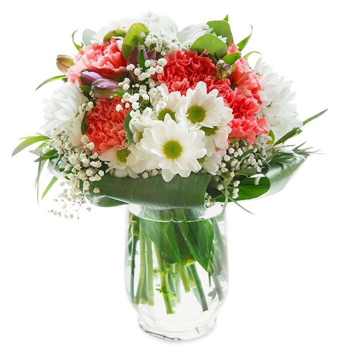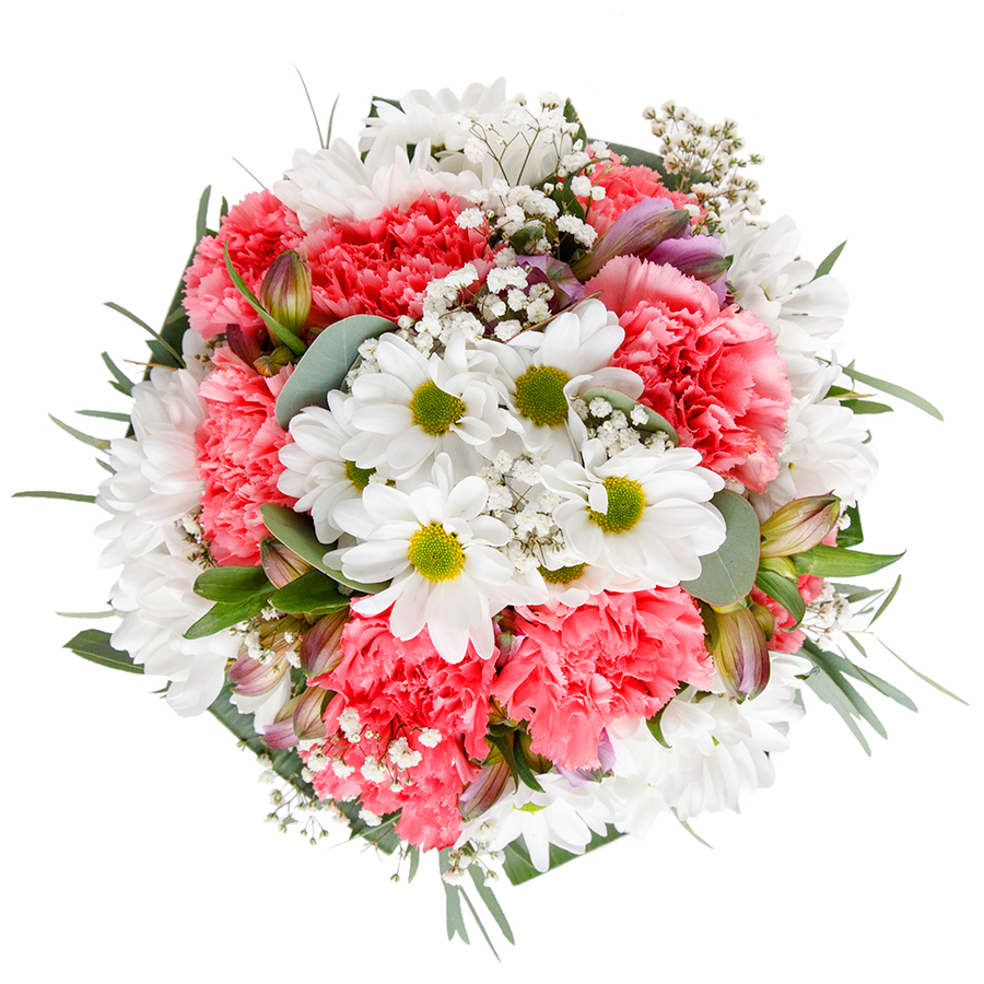 Our stunning flower arrangement combines the purity of white blooms with the softness of pink carnations, creating a visually captivating bouquet perfect for any occasion.